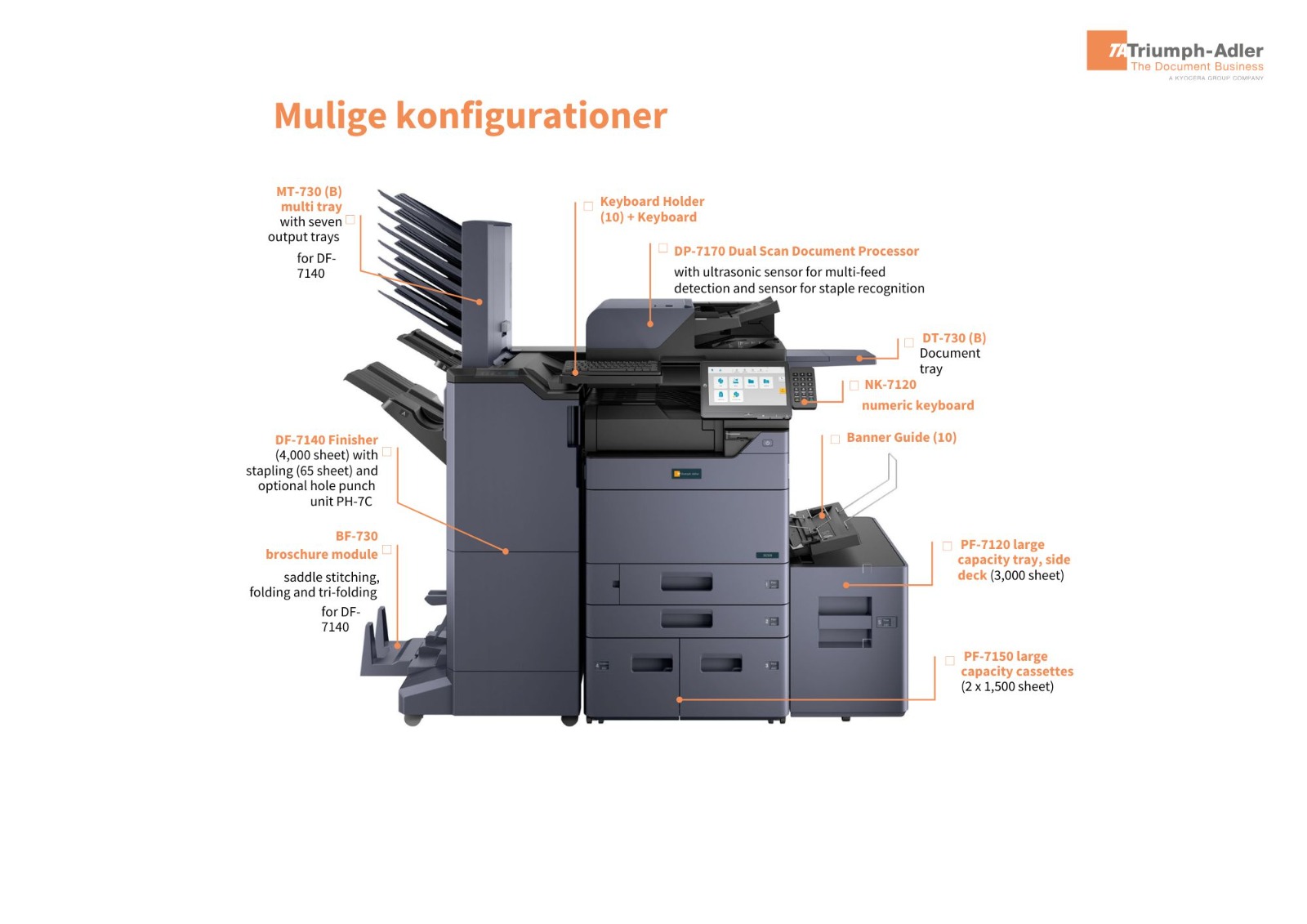 DF-7140 er en avanceret finisher, der effektivt færdiggør printopgaver direkte fra din Triumph-Adler maskine. Den kan hæfte op til 65 ark, sortere og stable dokumenter automatisk samt håndtere op til 4.000 ark i outputbakken. Finisheren giver mulighed for professionel efterbehandling med tilvalg som hul-perforering, foldning og brochureproduktion. Ideel til virksomheder med større printmængder, der ønsker tidsbesparelse og et ensartet, præsentabelt resultat uden manuel håndtering.